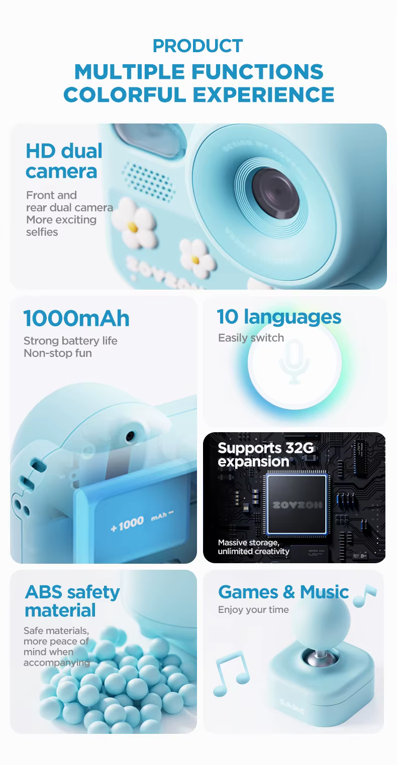 We present Zoy Zoii Travel Kid E28 Series Digital Camera - a cute companion who transforms any children's adventure into a colorful memory. Designed specifically for small researchers aged 3 to 12, this multifunctional camera boosts creativity, imagination and self-exploration of the world – all through play! Let your child start their own collection of memories, develop creativity and enjoy every shot - with Zoy Zoii Travel Kid Digital Camera, fun and learning come together.